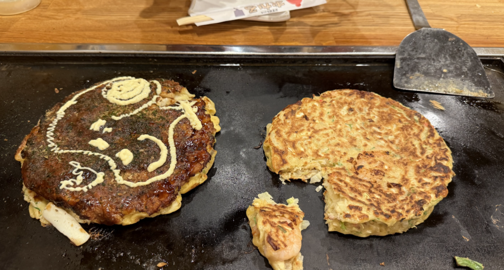 Described as a “savory pancake,” okonomiyaki is built around a simple, adaptable base: finely shredded cabbage folded into a light batter, then customized to your liking (that’s what okonomi means) with ingredients such as pork belly, seafood, scallions, or noodles. It’s cooked on a hot teppan grill, usually right at the table, turning the meal into a moment of theater and connection.